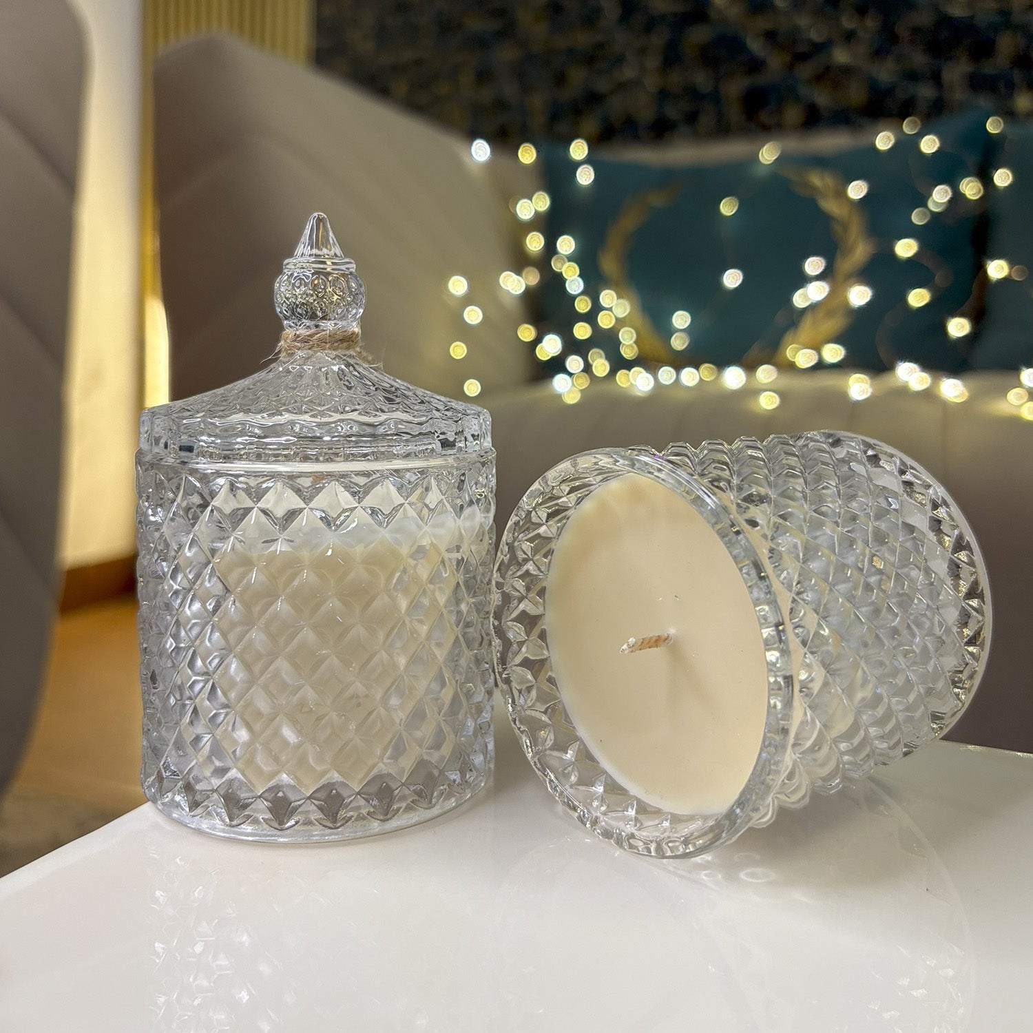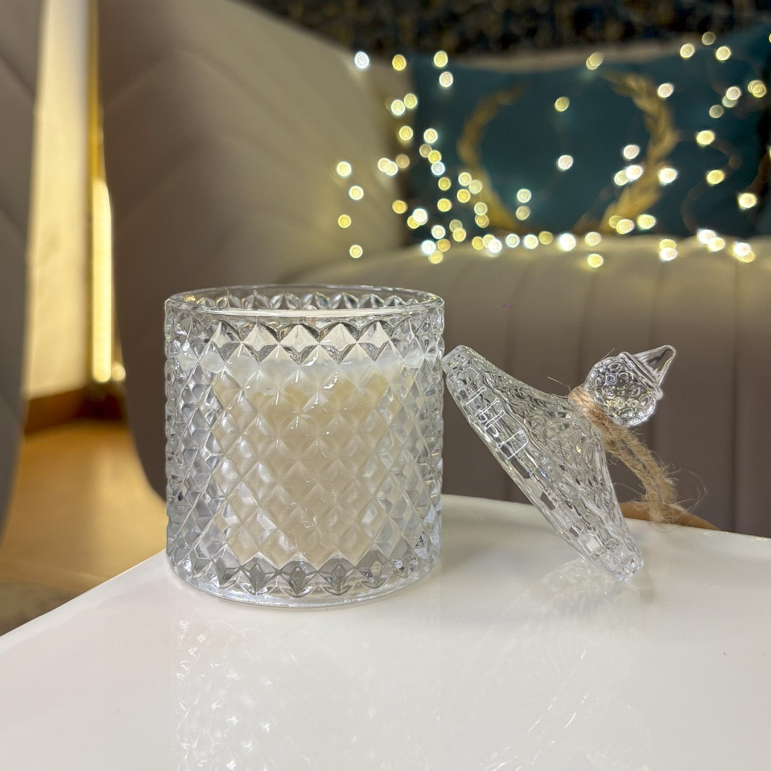 The Crystal Jar Candle blends the refined charm of cut-glass texture with the delicate notes of mogra. As it burns, the crystal glimmers beautifully, spreading serenity and subtle fragrance across your space.